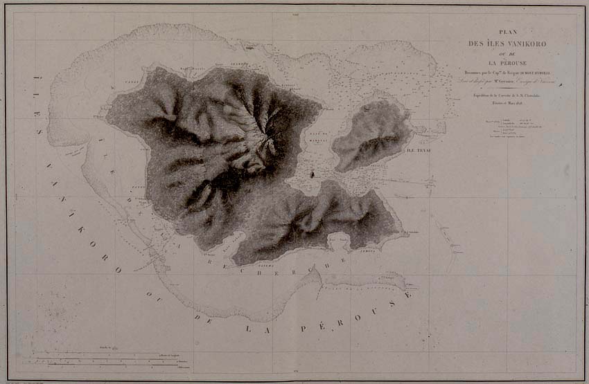 Plan des îles Vanikoro (ou de Lapérouse), extrait de l’Atlas du voyage de la corvette L’Astrolabe par J. Dumont d’Urville (1826 -1829), publié en 1833 Musée national de la Marine © MnM / P. Dantec